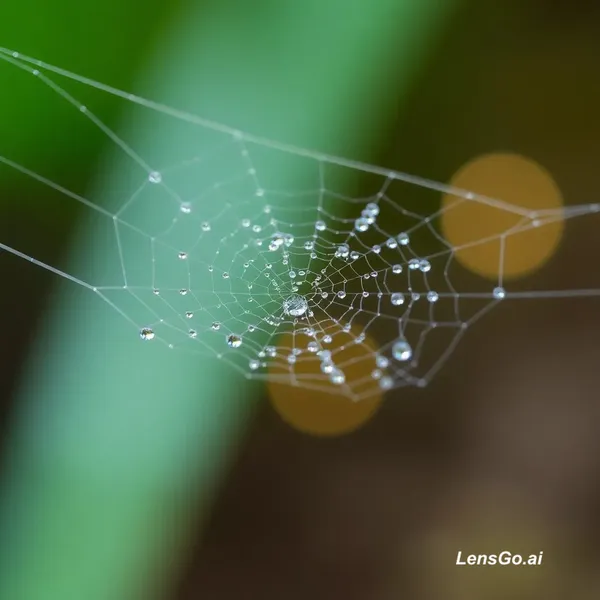 AI Image: Macro photograph of morning dew on spider web, bokeh background