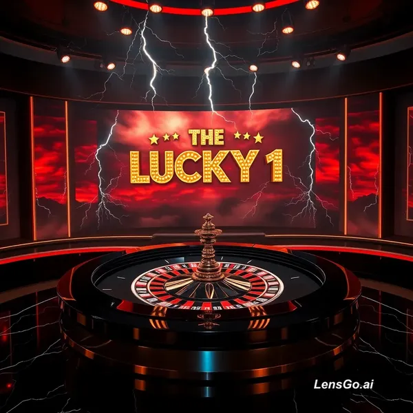 Ultra realistic high-end live casino studio set, centered elegant roulette table as the main focal point, luxurious design with gold and silver accents, polished chrome and glossy black marble surfaces, cinematic lighting, dramatic atmosphere. The studio feels electrifying yet sophisticated, combining premium casino elegance with high-energy visual effects. Background inspired by extreme lightning casino show style, with intense storm clouds at sunset, deep red and crimson sky, glowing atmospheric haze, dynamic lightning bolts and energy streaks illuminating the scene. Behind the roulette, a massive cinematic LED-style sign displays the text "THE LUCKY 1" in bold luxury typography, decorated with gold and red metallic effects, surrounded by animated thunder-like electric energy. The entire environment feels like a high-stakes live game show, futuristic casino broadcast stage, ultra-detailed, 8K resolution, volumetric lighting, depth of field, reflections, cinematic composition, dramatic contrast between warm gold luxury and violent electric storm energy.