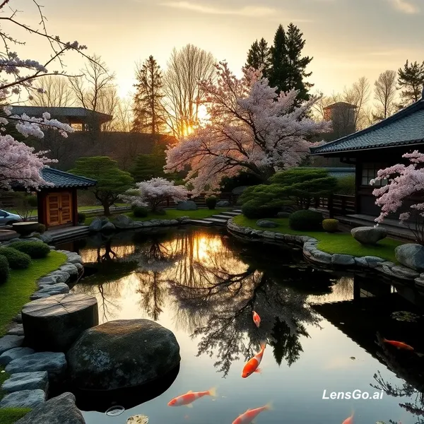 AI Image: A serene Japanese garden at golden hour, koi pond reflecting cherry blossoms