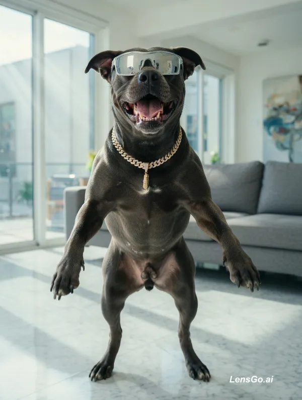 A cinematic, high-definition video of a [Insert Breed, e.g., Golden Retriever] wearing oversized silver sunglasses and a gold chain. The dog is standing on its hind legs in a brightly lit modern living room, rhythmically hopping and "dancing" to the beat. Its mouth moves in perfect sync with the lyrics "Who let the dogs out!", appearing to bark-sing the words. High frame rate, vibrant colors, and smooth camera pans.