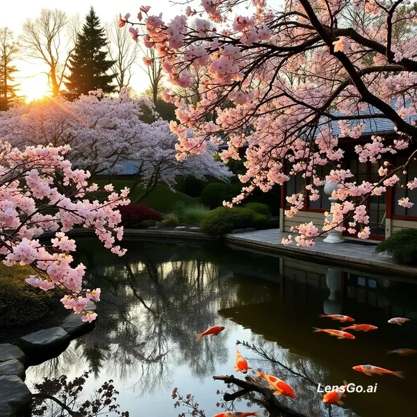 AI Image: A serene Japanese garden at golden hour, koi pond reflecting cherry blossoms