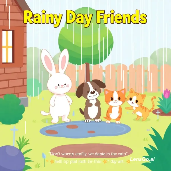 AI Image: Title: Rainy Day Friends Scene 1 — Outside a Little House Narrator: It’s a rainy morning, and little