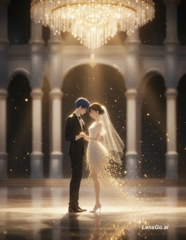 ultra cinematic anime scene of a young man with split hairstyle wearing an elegant black suit standing in a grand luxurious ballroom, massive chandeliers glowing with warm golden light, marble floor reflecting soft light, slow cinematic camera movement, then a graceful young woman in a flowing white dress appears from the distance walking slowly toward him, her dress moving softly as if in a dream, emotional and surreal atmosphere, then they gently hold hands and begin a slow elegant waltz dance, smooth and synchronized movement, soft lighting, romantic cinematic tone, then close-up of their faces with calm soft smiles, deep emotional connection without words, golden particles floating in the air, dreamlike ambiance, then as the music fades the girl slowly dissolves into glowing light while still dancing, leaving the boy standing alone in the vast empty ballroom, quiet and emotional ending, cinematic anime realism, volumetric lighting, shallow depth of field, film grain, slow motion, highly detailed, emotional but controlled, no text, no logo