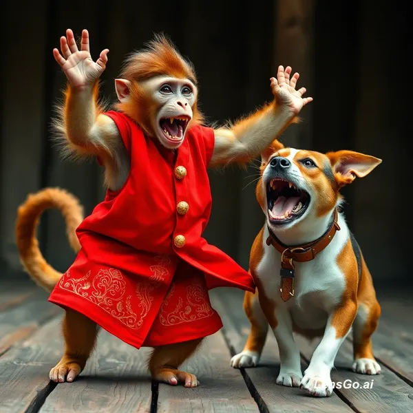 hyper-realistic, ultra-detailed 8K cinematic photograph of a light brown monkey dressed in a vibrant red traditional costume with golden embroidery and buttons, dancing energetically on a rustic wooden platform. The monkey’s mouth is wide open mid-expression, showing detailed teeth and tongue, arms raised in motion, one leg lifted, capturing dynamic movement with slight motion blur. Beside the monkey, a brown and white dog with a worn leather collar is barking loudly, mouth open, sharp teeth vis