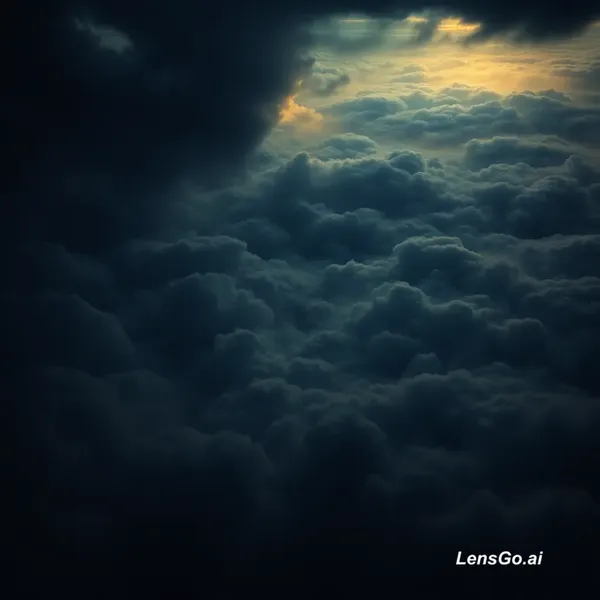 AI Image: cinematic dark cloudscape from above, towering storm clouds forming like waves, subtle glowing light