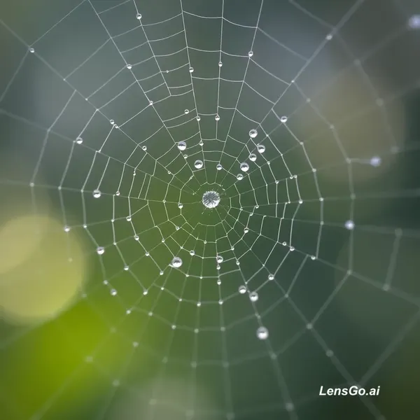 AI Image: Macro photograph of morning dew on spider web, bokeh background