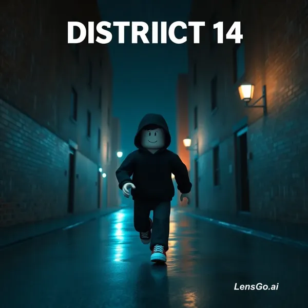 AI Image: "A high-quality Roblox game thumbnail for a project titled 'DISTRICT 14'. The style is a mix of grit