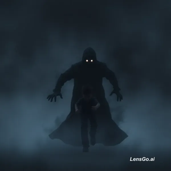 AI Image: faceless shadow entity chasing a boy, black smoky body, glowing eyes, fog, horror atmosphere sem
