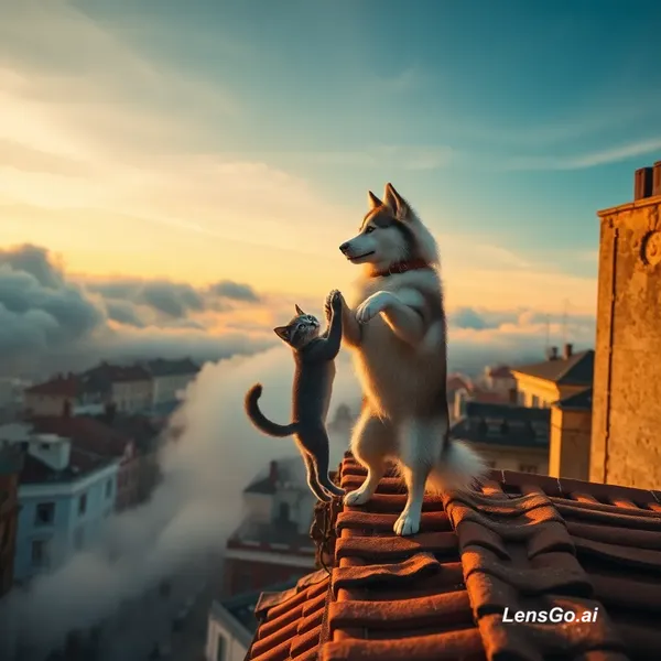 Cinematic aerial top shot looking down from the sky. The camera rapidly descends through the clouds towards a rooftop in a vintage European city during sunset. On the rooftop, a fluffy husky dog and a small gray cat are standing on their hind legs, dancing together gracefully. The cat twirls under the dog's arm. Warm golden hour lighting, soft shadows, slow motion, hyper-realistic, 8k resolution, film grain texture.