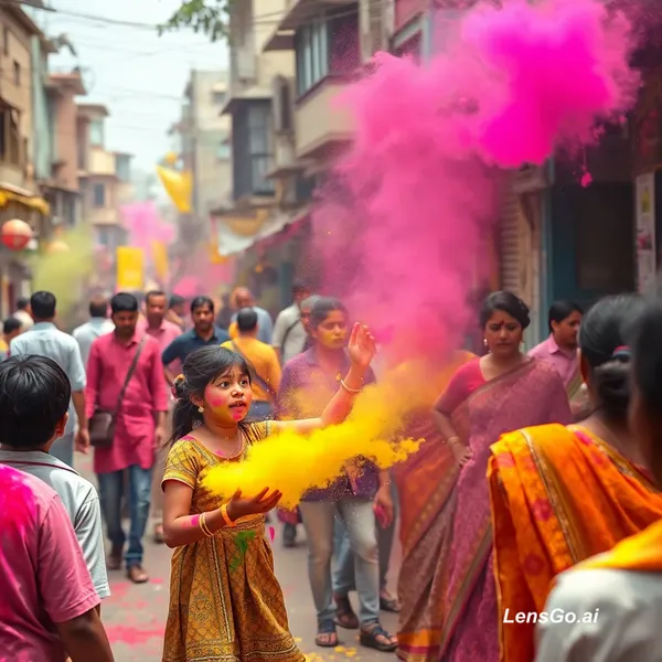 Realistic documentary-style video of Uttam Nagar in Delhi during the festival of Holi. Colorful Indian street full of people celebrating, children playing with gulal and water colors, vibrant clouds of pink, yellow and green powder in the air. A small girl accidentally throws color on a Muslim woman walking nearby. People around look surprised for a moment, crowd gathering in the street, realistic Indian houses and narrow lanes in the background, festive atmosphere, cinematic camera movement, emotional moment turning peaceful as elders calm the situation. Ultra realistic, 4K, natural lighting, documentary style.”