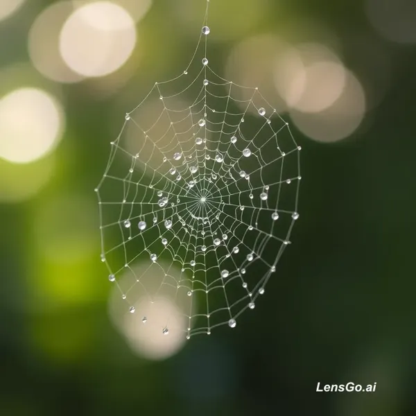 AI Image: Macro photograph of morning dew on spider web, bokeh background