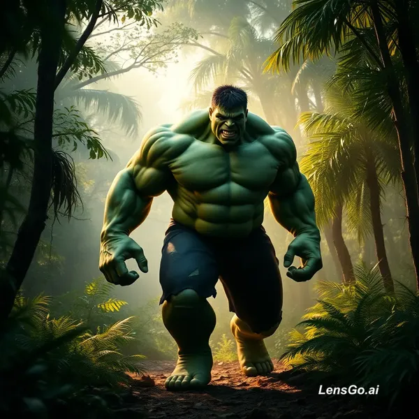 AI Image: Realistic cinematic scene of a huge green muscular Hulk walking angrily through a dense jungle, tree