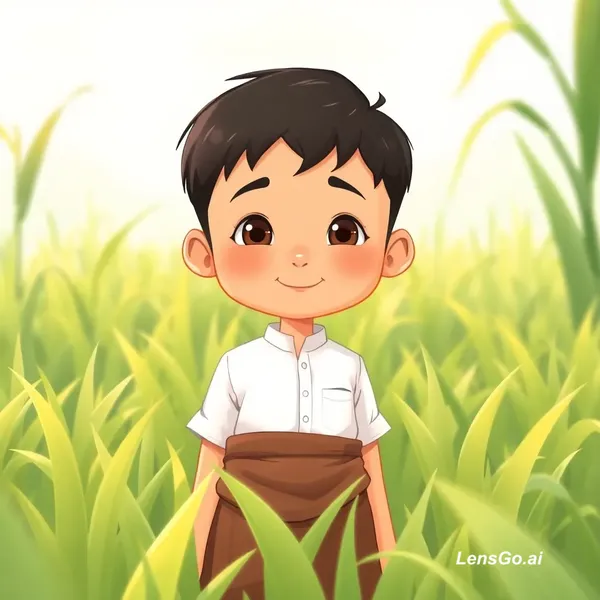 Prompt (English – AI image friendly): A cute 7-year-old Burmese village boy named Maung Min, wearing a simple white shirt and brown longyi, short black hair, bright curious eyes, smiling gently, standing in a green rice field, children storybook illustration style, soft pastel colors, warm sunlight, cartoon style, high detail, wholesome and educational vibe