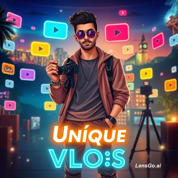 AI Image: A stylish YouTuber vlogger character representing "Unique Vlogs", standing confidently with a camera