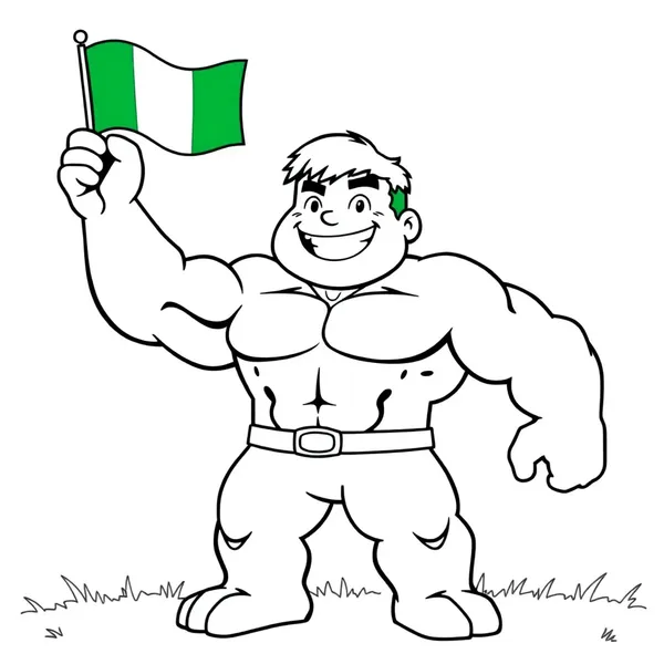 A simple black and white coloring page for kids of a big friendly superhero similar to Hulk, smiling and holding an Irish flag high in the air in one hand. The character should look strong but cartoonish and kid-friendly, with big muscles and a happy face. Clean bold outlines, minimal details, no shading, designed for easy coloring. The Irish flag waving proudly. Background simple with a few clouds and grass. Coloring book style, line art only, white background.