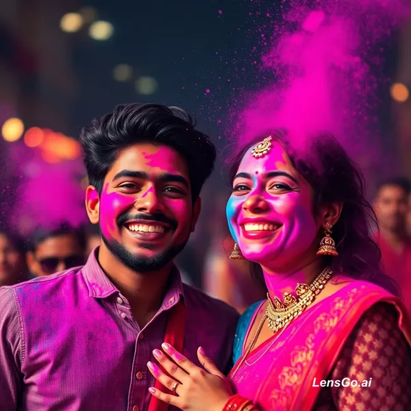 AI Image: High-speed photography masterpiece, joyful Indian couple celebrating Holi, vibrant pink blue and pur