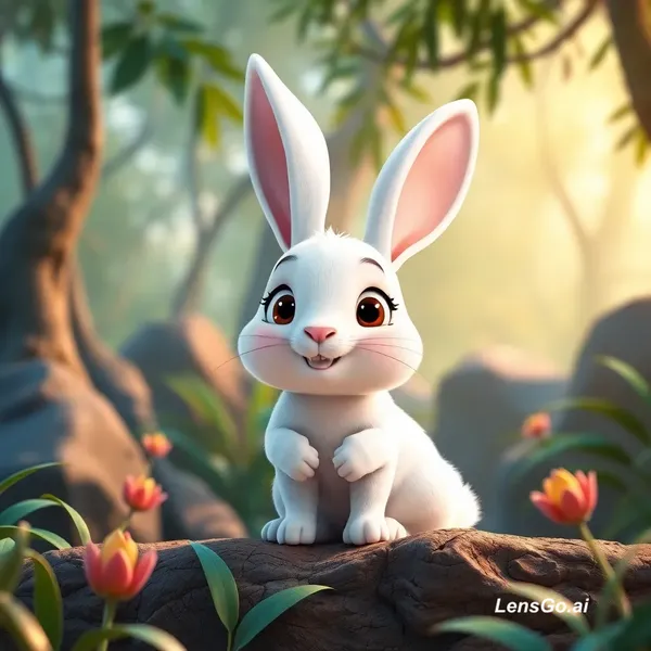 AI Image: cute white rabbit cartoon, pixar style, jungle background, 3D cartoon, ultra HD