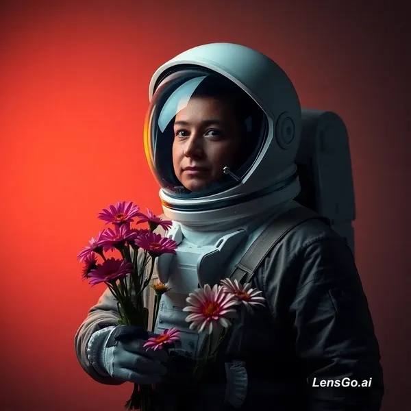 AI Image: Studio portrait of an astronaut holding flowers, dramatic lighting