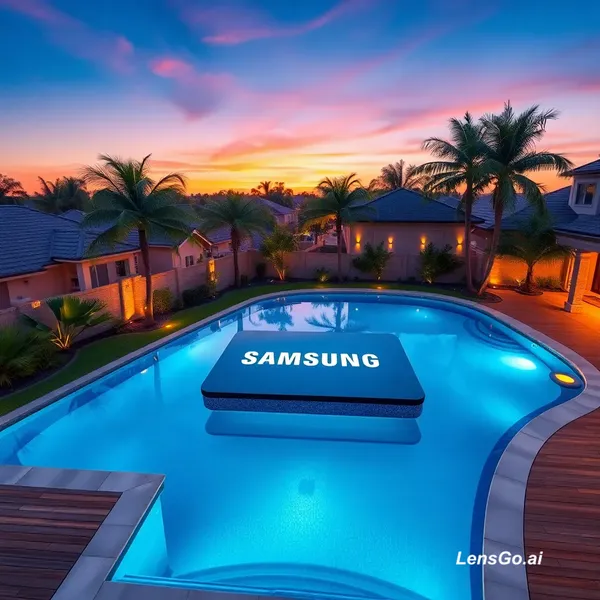 Ultra-realistic luxury backyard swimming pool designed in the shape of a giant smartphone inspired by Samsung Galaxy style, crystal clear blue water, a floating island shaped like a smartphone with "SAMSUNG" written on it, modern wooden deck around the pool, tropical palm trees and lush plants surrounding the backyard, luxury suburban houses in background, warm garden lights glowing along the fence, sunset sky with orange and purple tones, cinematic lighting, aerial drone perspective, ultra detailed, photorealistic, 8k, luxury resort style, calm water reflections in 9:16 ratio