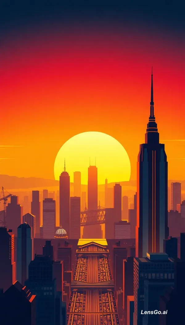 AI Image: Art deco poster of a futuristic city skyline at sunset