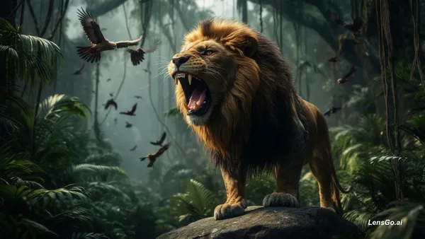 AI Image: ЁЯОе Scene 1 Prompt: A dense green jungle, cinematic lighting, birds flying, рдЕрдЪрд╛рдирдХ рдПрдХ powerful lion st