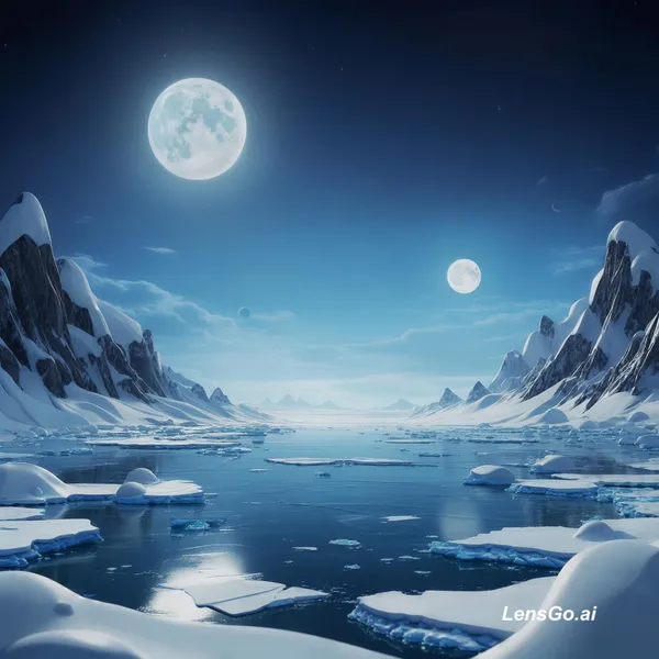 A landscape of an alien ice planet. It would include a frozen ocean, snow-covered mountains and no vegetation. In the distance we can see 2 moons that are apparently orbiting this planet.