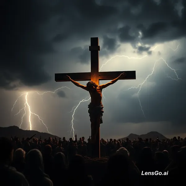 AI Image: Jesus crucified on the cross at Golgotha, dramatic dark stormy sky, lightning in background, crowd w