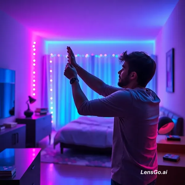 AI Image: A cinematic ultra-realistic video of a young man installing colorful LED strip lights in a modern be