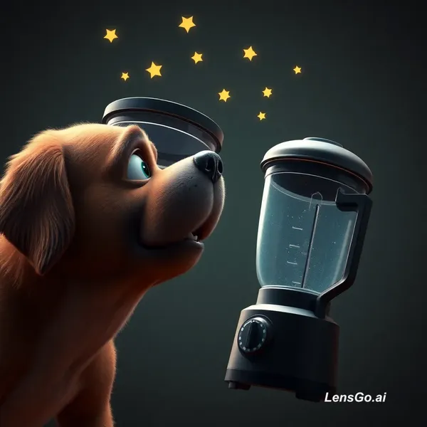 AI Image: The blender is shaking in fear, the big dog sniffs the blender and blinks curiously, stars circling