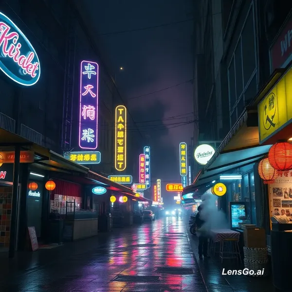 AI Image: Cyberpunk street market in the rain, neon signs and steam rising