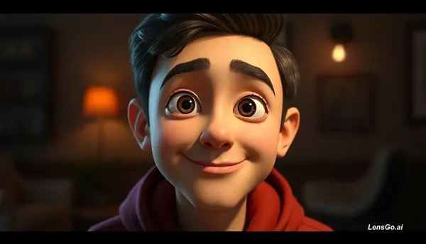 Using the attached photo of me, create a stylized 4D cartoon-style character based on my likeness. The character should feature exaggerated yet charming facial features, maintain my facial looks 100% - in the playful, heartwarming style of Pixar animation. Leave the eyes angle as it is facing in the original image and the background the same