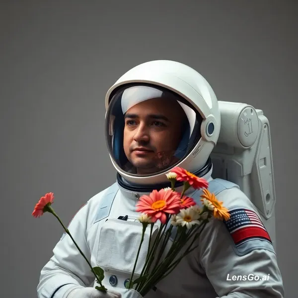 AI Image: Studio portrait of an astronaut holding flowers, dramatic lighting