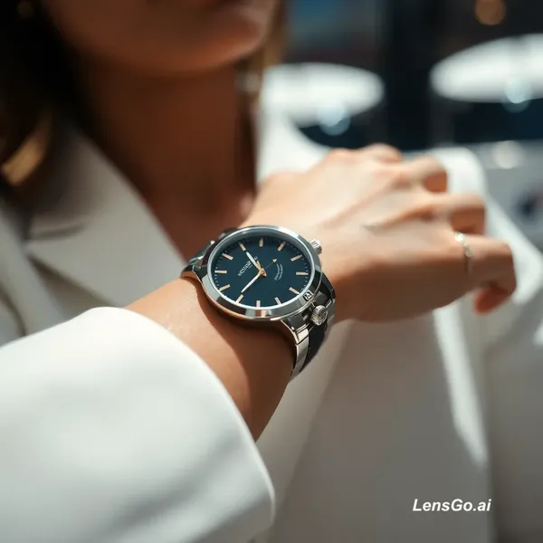 AI Image: Close-up of a luxury wristwatch on the white woman's wrist, elegant and premium design catching the