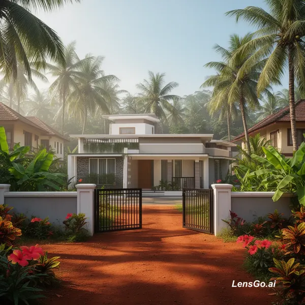 Re render this image into a hyper-realistic modern Kerala residential scene, keeping the original building's proportions but upgrading all textures, materials, and lighting for real-world detail. Place the home in a laxuary Kerala setting with dense tropical vegetation, coconut trees, banana plants, hibiscus, crotons, and natural red soil.with a gate fully opened, Include a Kerala neighborhood feel with a few other houses in the sides.Use a morning sunlight with deep, soft shadows, cinematic wide-angle framing, and ultra-detailed photorealistic rendering with compound wall gates.. The final output should look like a real photograph taken in Kerala with rich atmosphere, slight natural imperfections, and high-end architectural visualization quality.
