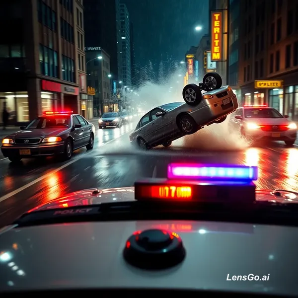 A cinematic, high-speed car chase at night on a wet city street during a rainstorm. The camera is mounted on the front hood of a police car, capturing the flashing red and orange emergency lights in the foreground. A silver sedan is seen speeding away through traffic, splashing through puddles. The police car accelerates, weaving through the wet streets to catch up. The chase reaches a climax when the silver sedan loses control, clips another vehicle, and flips over spectacularly in mid-air, spinning toward the camera amidst a spray of water and debris. The lighting is dramatic, with city neon and streetlights reflecting off the wet pavement.