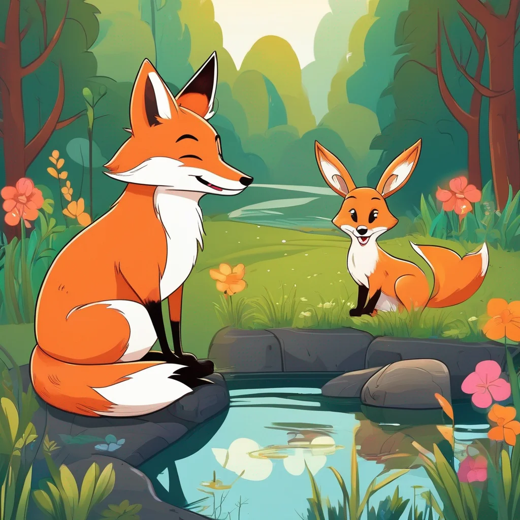 "A clever and arrogant fox named Mirzu laughing and talking to a small rabbit near the pond, playful cartoon style, colorful forest background"
