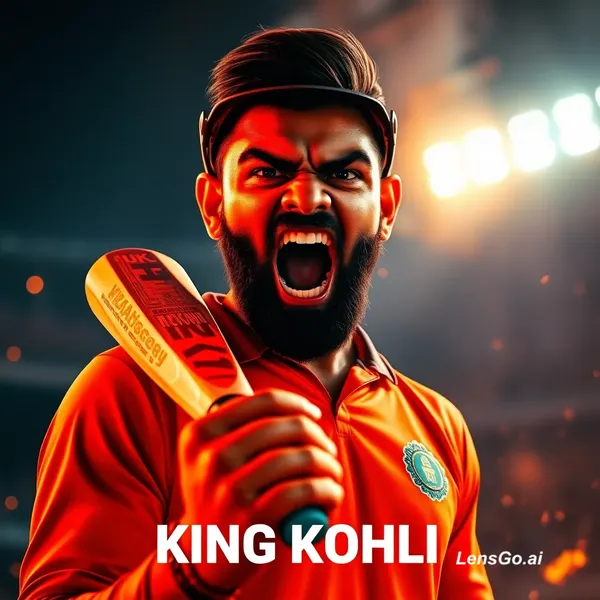 Virat Kohli aggressive expression, holding cricket bat, roaring in stadium, fire flames background, sparks flying, dramatic cinematic lighting, sweat on face, ultra realistic, 4k, high contrast, glowing red and orange tones, powerful aura, youtube thumbnail style, bold text "KING KOHLI 🔥"