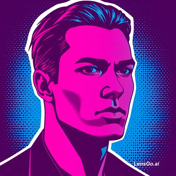 A HIGH-CONTRAST, POP-ART STYLE PORTRAIT WITH A HEAVY HALFTONE DOT PATTERN OVERLAYING THE ENTIRE IMAGE. THE COLOR SCHEME IS DUOTONE-INSPIRED, FEATURING A DISTINCT RED-PINK COMPLEXION ON THE SUBJECT AND DEEP BLUE-INDIGO TONES IN THE SHADOWS AND BACKGROUND. THE FIGURE IS OUTLINED WITH A THICK, CRISP WHITE BORDER, GIVING IT A CUT-OUT STICKER' OR POSTER EFFECT. THE OVERALL LOOK IS RETRO COMIC BOOK MIXED WITH DIGITAL FILTER STYLING.