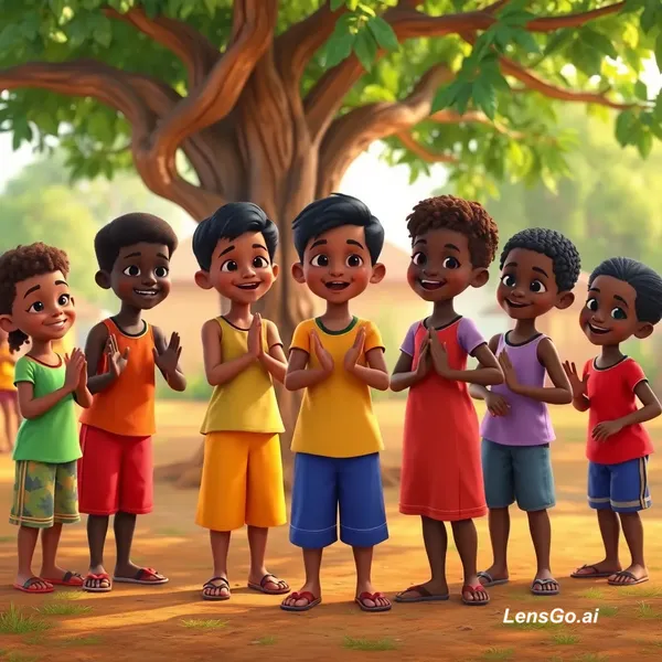 Prompt: A group of African children standing in a circle under a large tree in a lively village setting. The children are smiling, energetic, and dressed in colorful casual clothes. They begin a playful rhythm game together. First, all the children clap their hands three times in sync (clap! clap! clap!), creating a joyful sound. Then, each child places their hands on their waist and starts shaking their waist side to side in a fun, rhythmic dance. After that, they bend down low and rise back up repeatedly, moving together in perfect coordination. The atmosphere is cheerful and playful, with laughter, singing, and natural village sounds in the background. The camera moves slightly around the circle, capturing different happy faces and movements. Bright daylight, warm tones, and a vibrant, cultural village environment. Style: 3D cartoon animation, smooth motion, expressive faces, colorful and lively scene. Duration: 6–10 seconds.