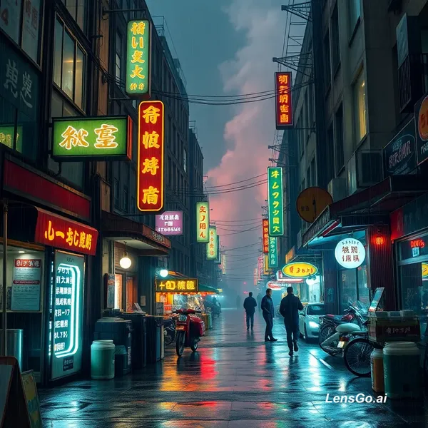 AI Image: Cyberpunk street market in the rain, neon signs and steam rising