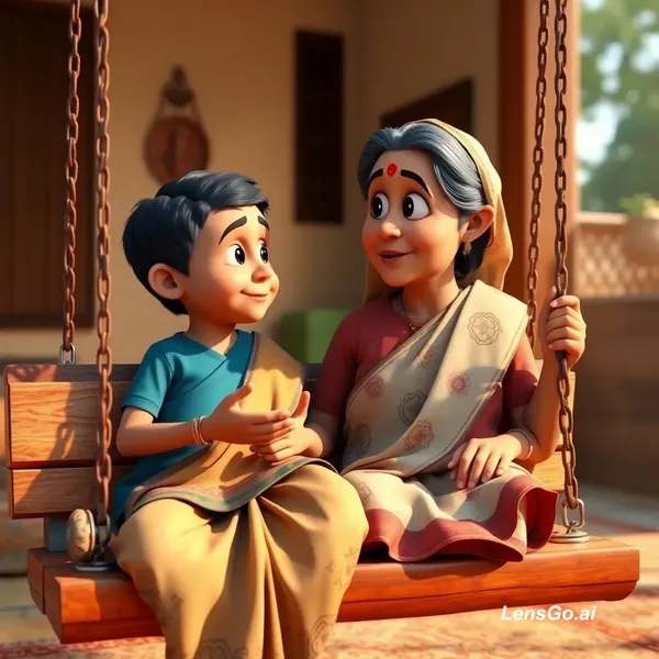 AI Image: "An emotional 3D animation of an Indian grandmother sitting on a wooden swing (jhoola) with her litt