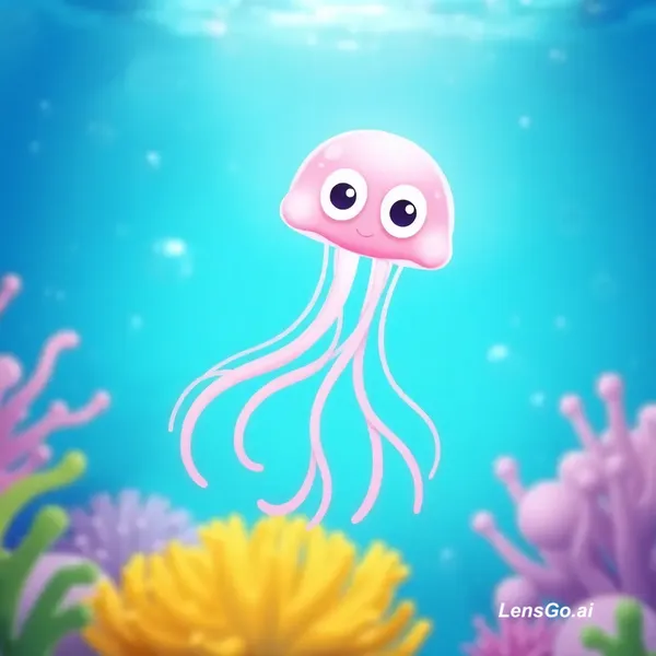 AI Image: Bright underwater scene, blue ocean, bubbles floating, Jelly (light pink jellyfish, glowing, big shi