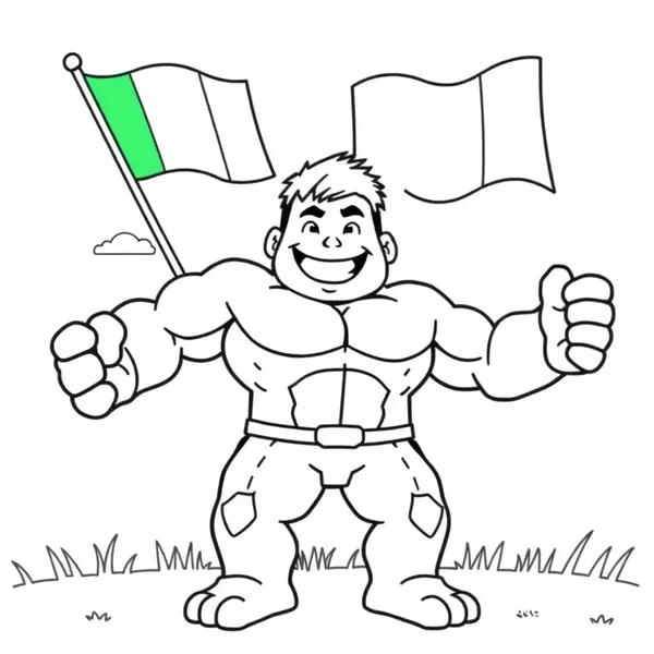 A simple black and white coloring page for kids of a big friendly superhero similar to Hulk, smiling and holding an Irish flag high in the air in one hand. The character should look strong but cartoonish and kid-friendly, with big muscles and a happy face. Clean bold outlines, minimal details, no shading, designed for easy coloring. The Irish flag waving proudly. Background simple with a few clouds and grass. Coloring book style, line art only, white background.