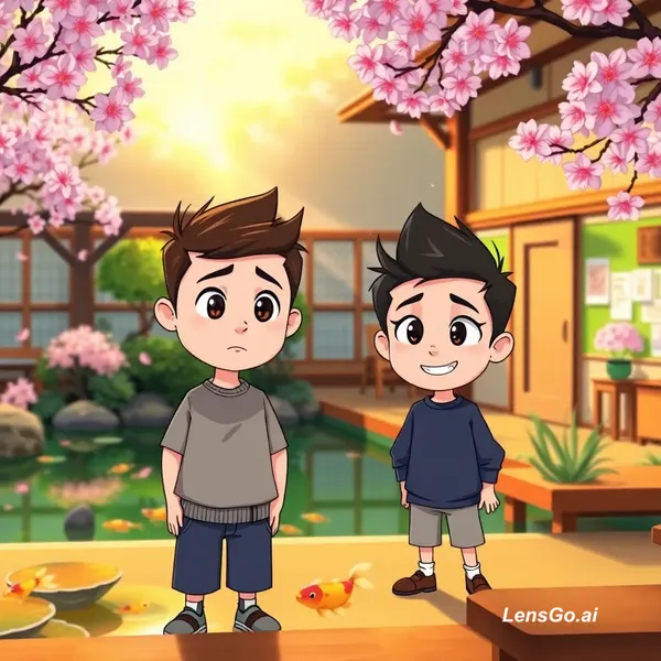 AI Image: A serene Japanese garden at golden hour, koi pond reflecting cherry blossomsTwo cartoon boys standin