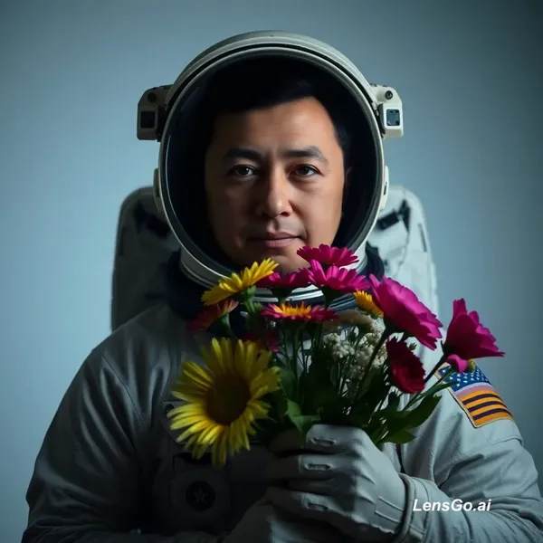 AI Image: Studio portrait of an astronaut holding flowers, dramatic lighting
