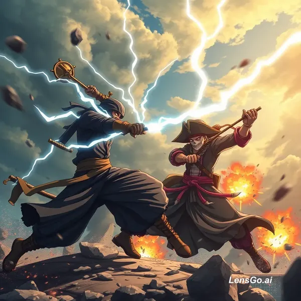 AI Image: epic anime battle, ninja vs pirate warrior, lightning powers, dramatic sky, explosions, cinematic an