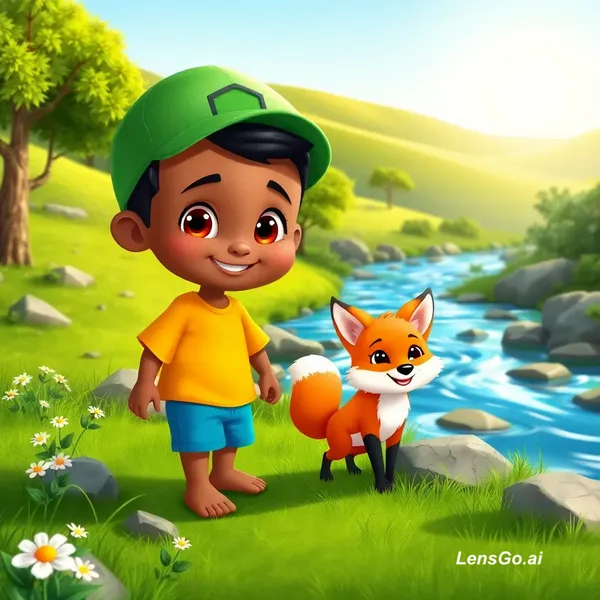 A high-quality 3D cartoon style illustration of a young Somali boy named Hirsi playing with his fox best friend near a clear flowing river. Hirsi has warm brown skin, big expressive eyes, short black hair, wearing a green cap, yellow t-shirt and blue shorts, barefoot and smiling happily. The fox is small, fluffy, bright orange with white chest and tail tip, playful and friendly. They are in a beautiful green landscape with trees, flowers, rocks, and soft sunlight. Background includes rolling hills.