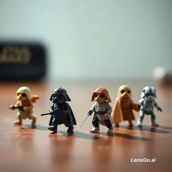AI Image: Miniature Star Wars inspired creatures walking across a tabletop, tiny detailed figurines with soft