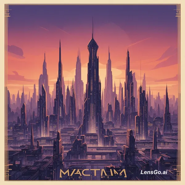 AI Image: Art deco poster of a futuristic city skyline at sunset