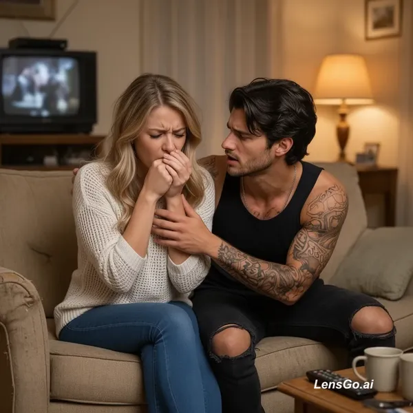 AI Image: La chica tose cubriéndose la boca.el chico reacciona con angustia, la sujeta con ternura y le habla